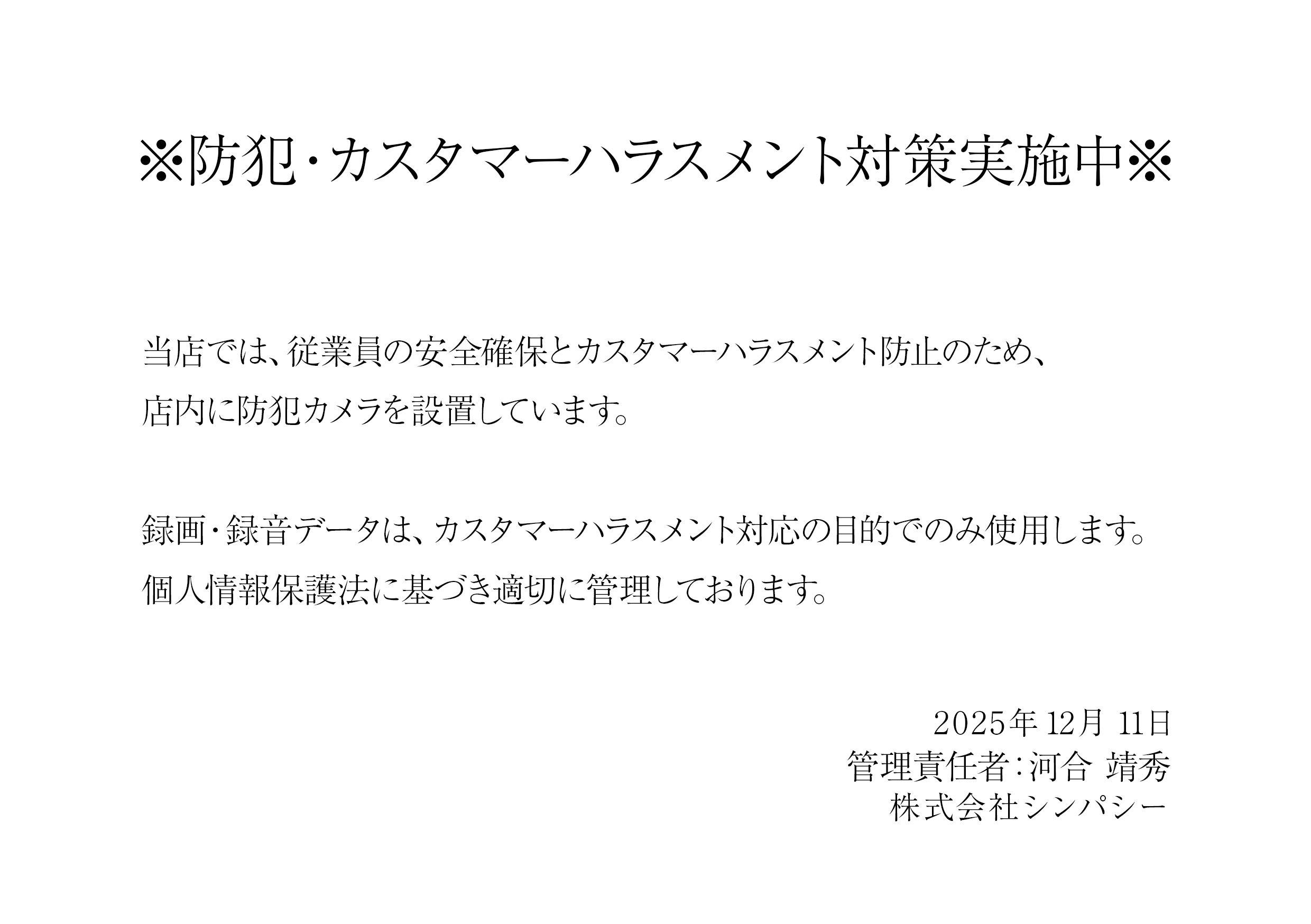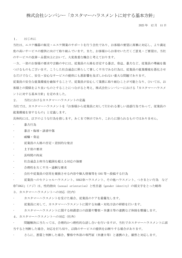 カスタマーハラスメント防止対策につきまして 2025.12.11 株式会社シンパシーは東京都が推進する「カスタマーハラスメント防止推進事業」に則り、カスタマーハラスメントの対策を実施しております。 なにとぞご理解のほどよろしくお願いいたします。
